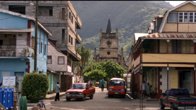 Then we go to the Dominican Republic or at least we see some establishing shots that would lead us to believe this. In reality the establishing shots are not even the Dominican Republic. When I first saw it I thought it looked more like Puerto Rico and when I saw the third shot I knew it was. I recognize the Saint Felipe Cathedral in Arecibo, Puerto Rico.