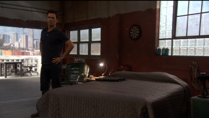 The episode starts out at Michael’s apartment, a studio set. Michael is left eating yogurt while Sam packs to go on the mission leaving Michael uncomfortable. Unfortunately the Miami skyline in the background is pretty clearly fake.