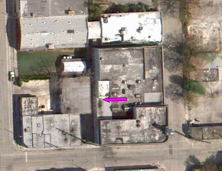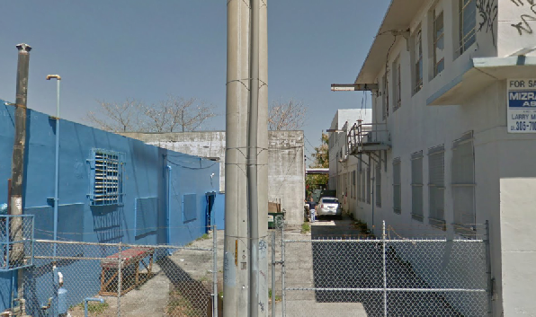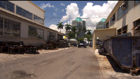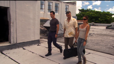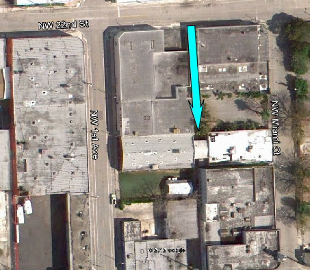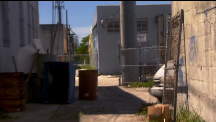Next we see our gang on a roof top. This was filmed atop a vacant building on the NW corner of the intersection of NW Miami Ct. and NW 21st Street in Miami. They walk westbound across the roof toward the alley. This is not the first time Sam has been on this roof. He was atop this building when it was Omar’s warehouse in episode 39, Friendly Fire. He was up here to rig the garage door for Michael.