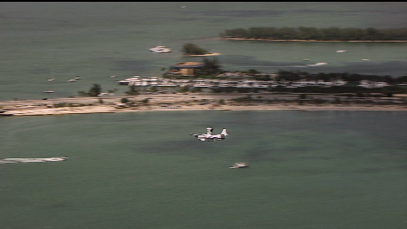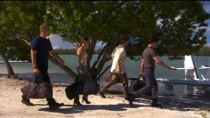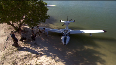 The team gets away via seaplane. This was filmed in the basin at the Miami Rowing and Water Sports Center.